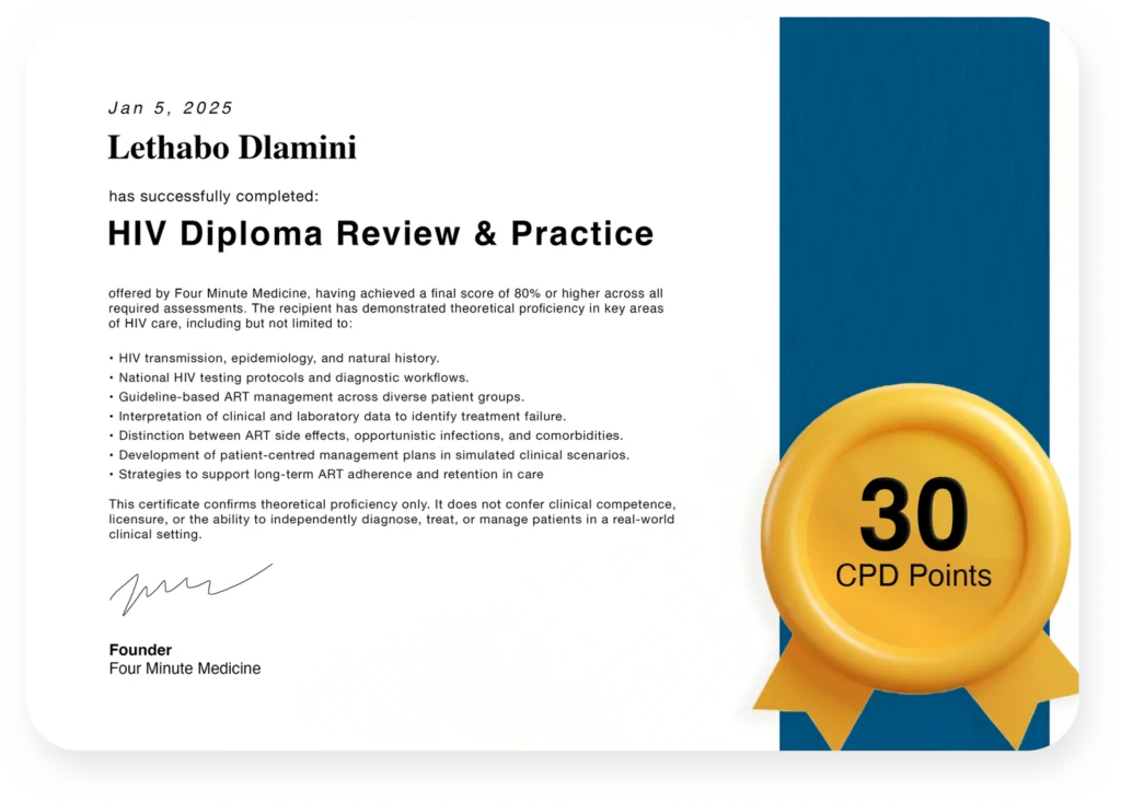 The HIV Diploma Course Bundle is a complete resource to prepare for the HIV Diploma Exam. Earn 30 CPD points with content covering all CMSA EPAs and the latest HIV guidelines.